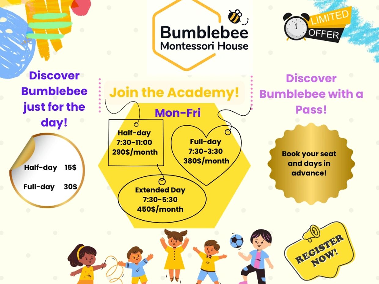 We’re so glad you’re here. At Bumblebee Montessori House, we welcome families into a nurturing, joyful learning community and children from 2.5 years old to 6 year old.